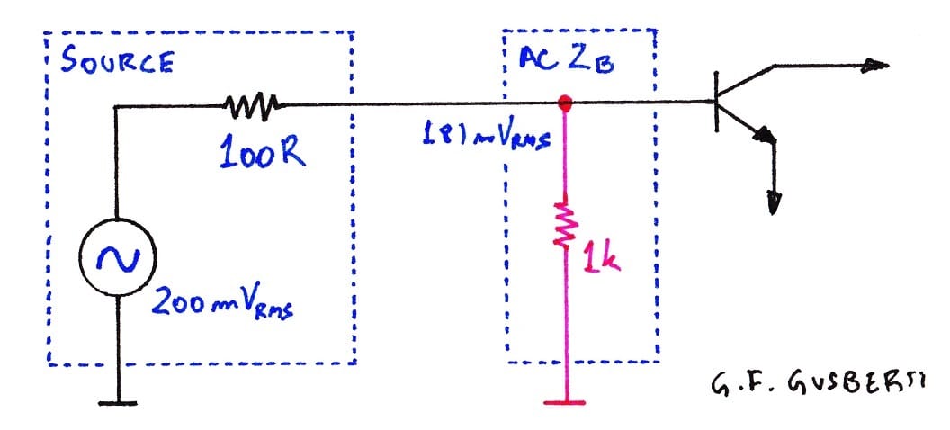 Equation 1 shows that the excitation at the base of the transistor in Figure 1 will be 181 mVrms, calculated as a simple voltage divider. The amplifier input impedance being ten times higher than the source's impedance leads to an almost perfect transfer of the generator's voltage swing to the base of the transistor.