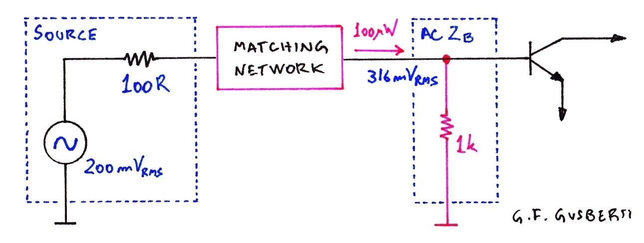 Figure 3 shows the configuration with an impedance matching network added in between the signal source and the transistor amplifier. The matching network bridges both impedance profiles: the generator side working at 100 Ω and the amplifier side working at 1 kΩ.
