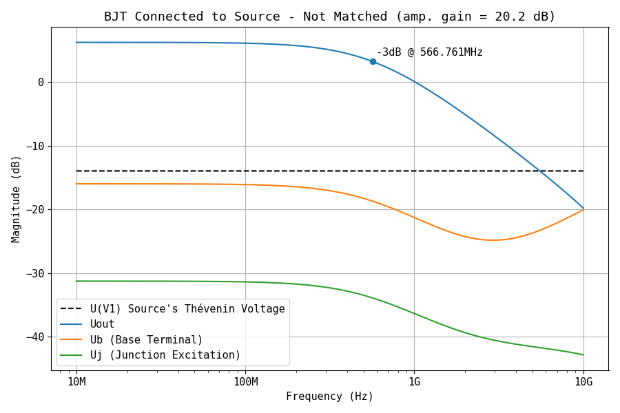 Figure 8 shows the voltage Ub at the base terminal, the output voltage Uout at the output load, and the internal base-emitter excitation voltage Uj. The configuration presents a gain of 20.2 dBV (a voltage gain, as the source and load impedance are different), and it is possible to see the cutoff frequency at ~566 MHz.