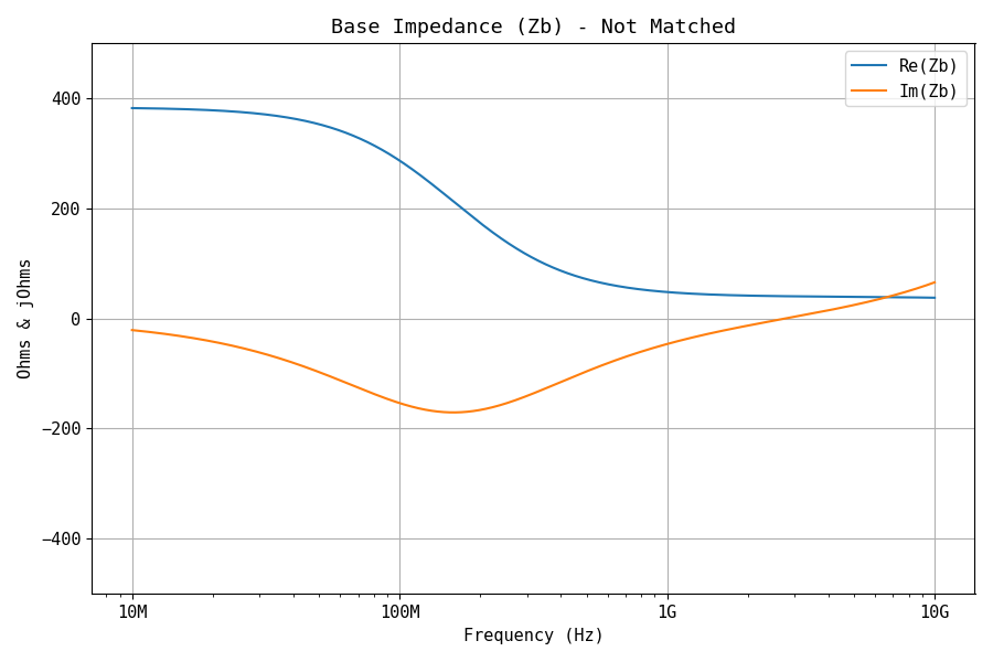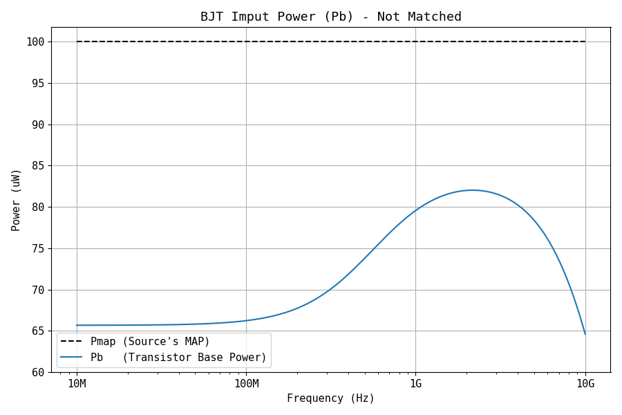 It is also interesting to notice that the power entering the transistor's base varies over frequency in a non-intuitive way. Later, we are going to see that the power over the junction, Pj, also has a complex-shaped frequency roll-off.