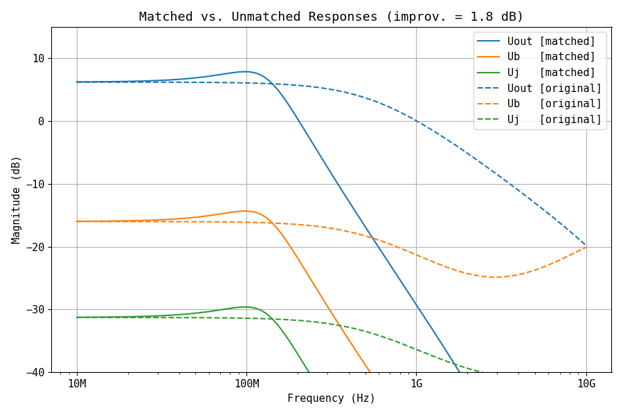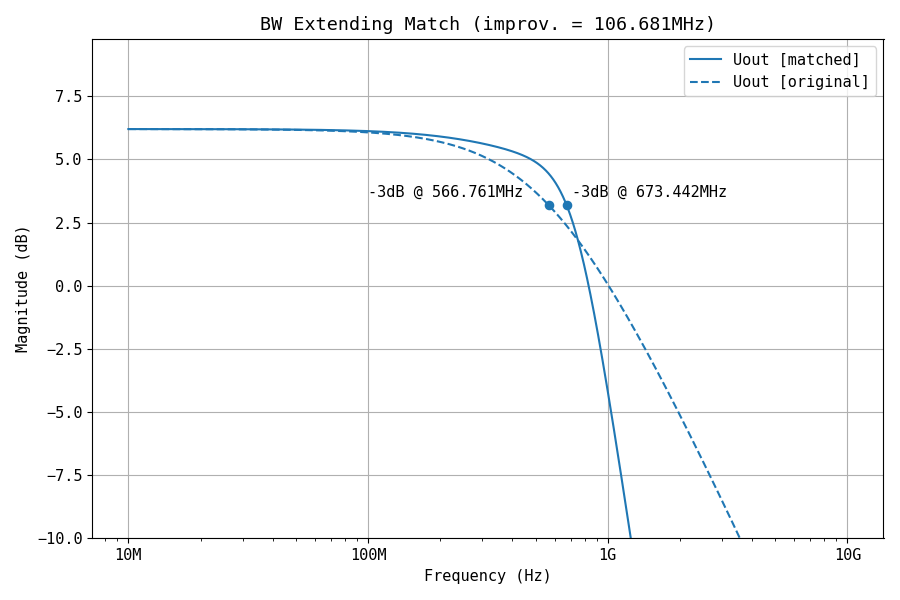 In Figure 15, the matching network was moved near the -3 dB frequency point of the amplifier's original response. Improving the match near the roll-off region can be used as a way of linearizing the frequency response, compensating for the natural low-pass behavior of the amplifier structure.