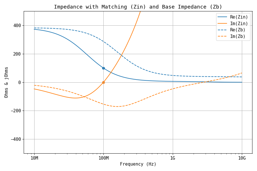 Figure 13 compares the input impedance at the impedance matching network (the impedance that the signal source experiences) to the base impedance. The LC circuit performs its job and transforms the impedance to exactly 100 R at 100 MHz.