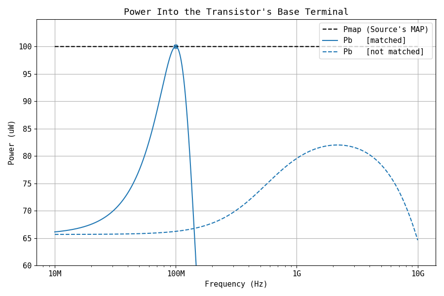 The power entering the transistor base is indeed optimized to the maximum available power of the source, as seen in Figure 14. The Pavs is achieved exactly at - and only at - the design frequency of the matching network.