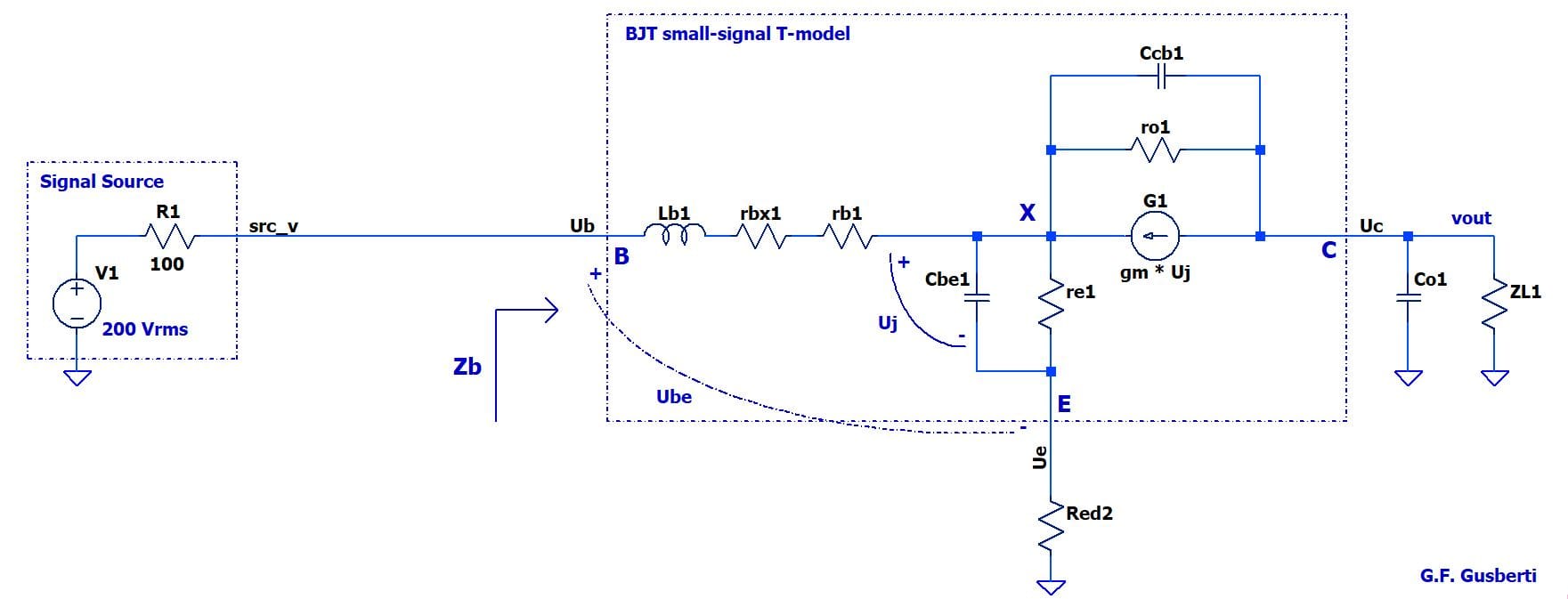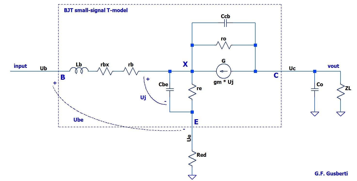 Modulation of the collector current - that produces an output voltage swing over ZL - continues to be determined by the voltage across re but, as it is clear in Figure 6, this voltage is now internal to the transistor model and is named Uj (junction voltage) to differentiate it from the terminals' voltage Ube.