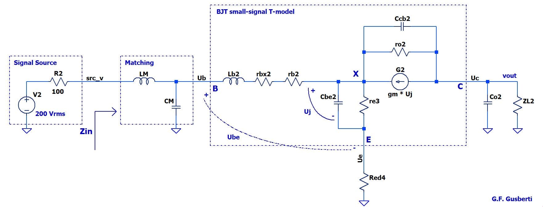 We start by connecting the model to the signal source, as seen in Figure 7, and capturing its behavior in simulation. The SPICE simulation stands out as it allows one to measure internal voltages and currents; for example, the input impedance of the transistor is calculated by dividing the Ub voltage by the signal generator current I(V1).